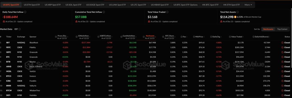 US spot Bitcoin ETFs recorded internet outflows of $188.64 million on Dec. 23, extending the current cooling in institutional demand.