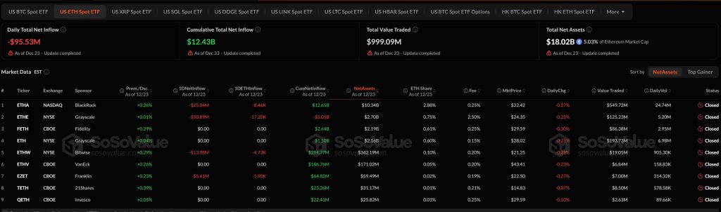 US spot Ether ETFs reversed course on Dec. 23, posting internet outflows of $95.53 million after a day of inflows earlier within the week.