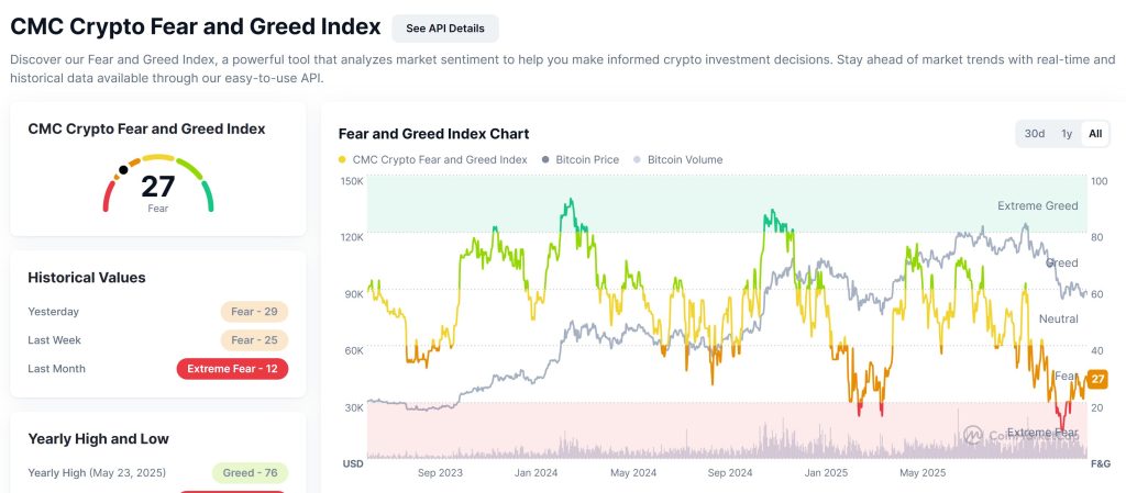 - Market sentiment stays weak, with the Fear & Greed Index at 27 (concern);