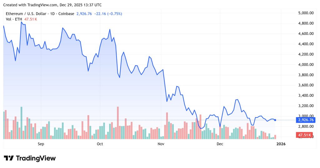 Ethereum is following an analogous construction, at the moment buying and selling round $2,926, down roughly 0.8% over the previous 24 hours. The chart reveals ETH breaking sharply decrease in early November earlier than getting into a uneven consolidation section beneath the $3,200 stage.