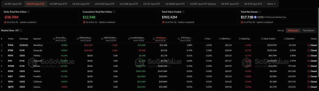 US spot Ethereum ETFs additionally recorded web outflows of $38.7 million on Dec. 26. The pullback was pushed by two funds. BlackRock’s ETHA led the declines with $22.12 million in outflows, adopted by Grayscale’s ETHE, which noticed $16.58 million depart the fund. The remaining ETH ETFs posted flat flows, with no merchandise recording inflows throughout the session.