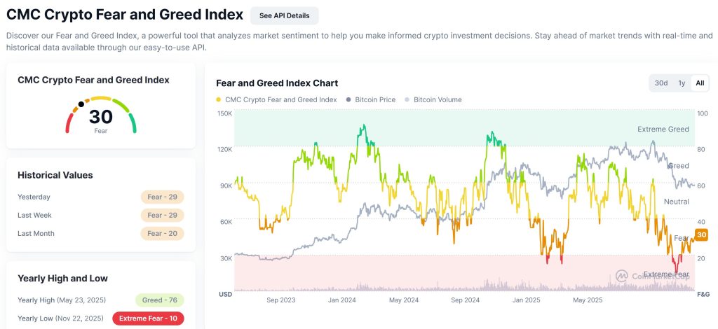 - The Crypto Fear and Greed Index holding at 30 within the concern zone;
