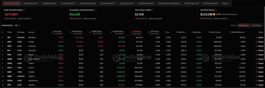 US Bitcoin spot ETFs ended the most recent session within the pink, with web outflows of $275.88 million on Dec. 26, in line with the information proven. Cumulative web inflows nonetheless stand at $56.62 billion, whereas whole web belongings throughout US BTC spot ETFs stay elevated at $113.53 billion, equal to roughly 6.5% of Bitcoin’s whole market capitalization.
