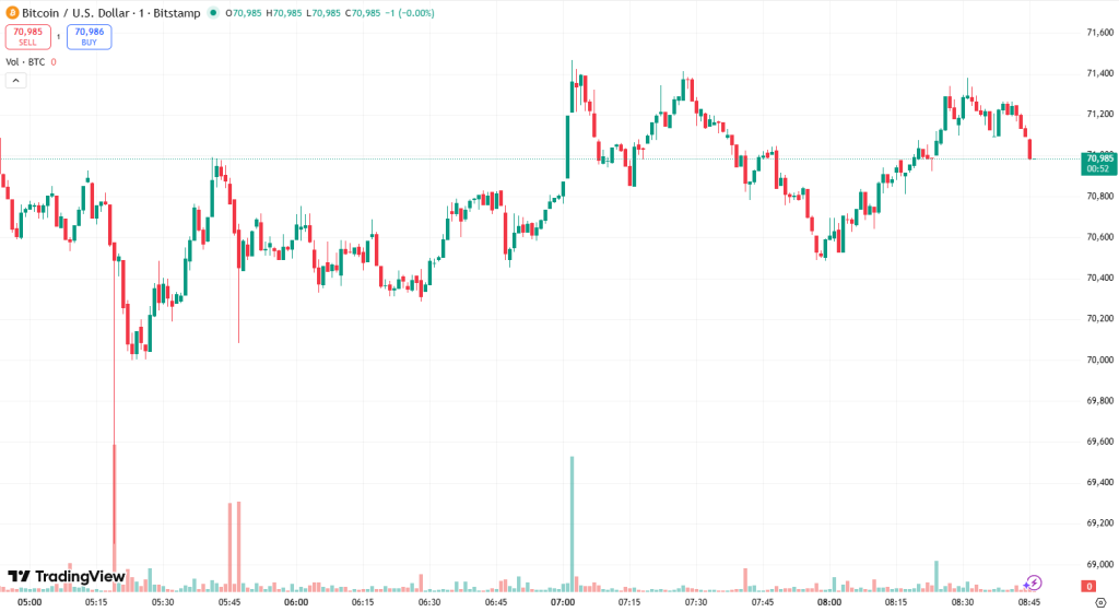 At the time of writing on Thursday morning, BTC was buying and selling at $70,884. The value noticed a comparatively gradual lower from the intraday high of $76,472 to the intraday low of $70,119.
