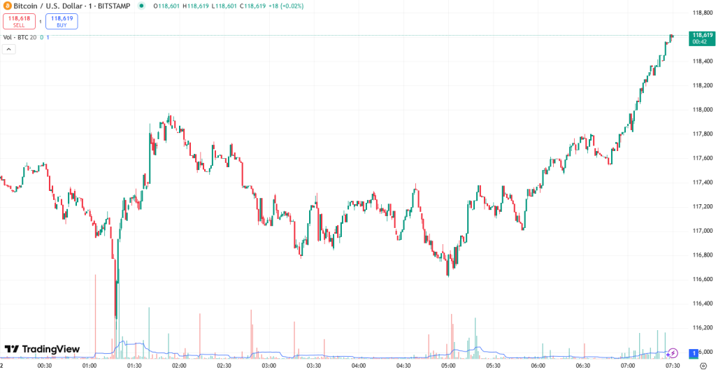 At the time of writing, BTC trades at $117,854. The coin began a decline $119,523, reaching the lowest point today of $116,787. It then resumed a climb to the current level. The price is up 1.1% over the past seven days.