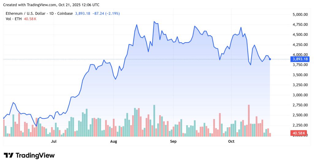 Meanwhile, Ethereum (ETH) is buying and selling at $3,893, down 2.19% prior to now day. The coin reached a each day high close to $3,980 earlier than retreating to its present stage, with a 7-day low round $3,750.