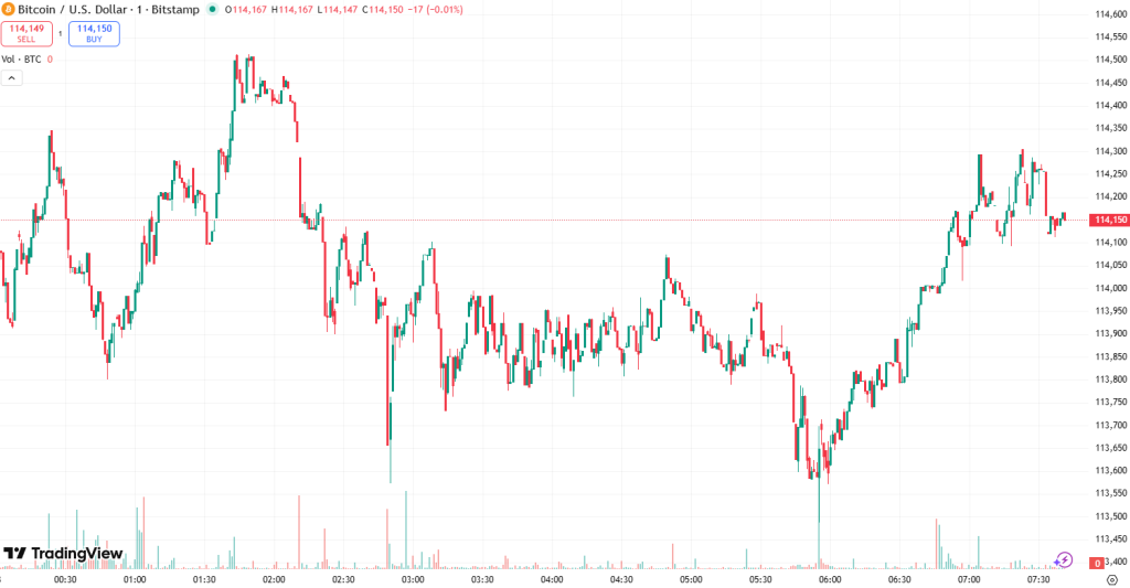 At the time of writing on Tuesday morning, BTC trades at $114,289. For the primary a part of the day, the coin traded sideways till it reached the intraday high of $115,755, earlier than it plunged to the day’s low of $113,599 close to the time of writing.