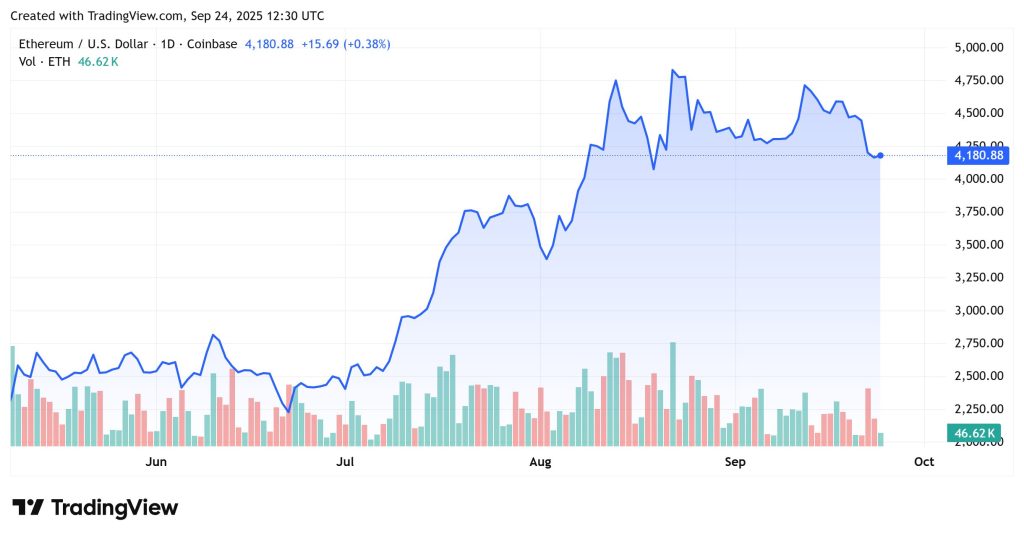 Meanwhile, Ethereum (ETH) is buying and selling at $4,180, up 0.38% up to now 24 hours. The value stays range-bound after a pointy drop from the $4,700–$4,800 zone earlier this month. Despite the delicate rebound, momentum is proscribed.