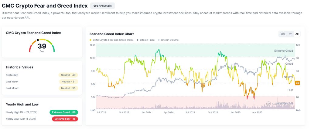 Meanwhile, market sentiment has shifted barely into the damaging zone. The CMC Crypto Fear and Greed Index is now at 39, down from 40 yesterday and 51 final week, marking a transfer from impartial into concern territory.