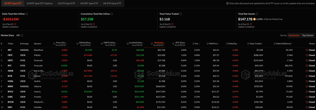 The US Bitcoin spot ETFs noticed a web outflow of $103.61 million on September 23, pulling again from current positive factors and highlighting cautious sentiment. Despite the dip, the cumulative web influx throughout all ETFs nonetheless stands at a wholesome $57.25 billion, with whole property beneath administration at $147.17 billion, representing 6.60% of Bitcoin’s market cap.