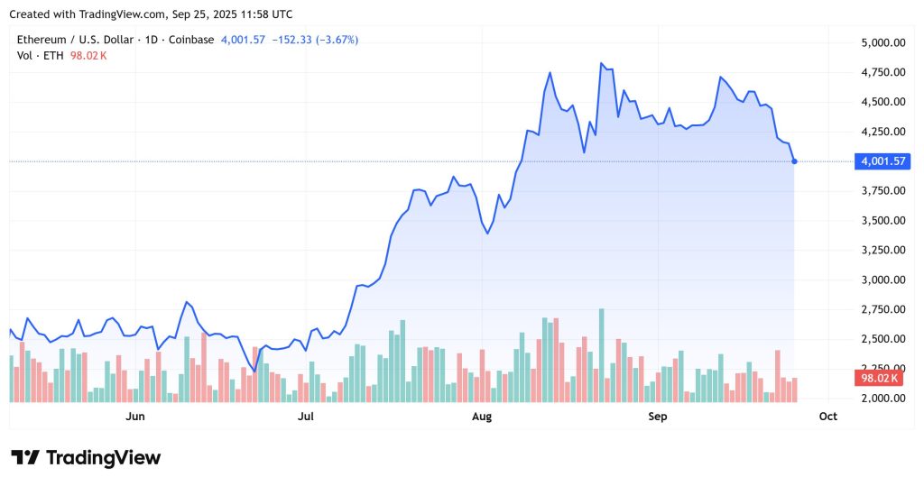Meanwhile, Ethereum (ETH) is beneath heavier stress, falling 3.67% to $4,001.57. ETH briefly held the psychological $4,000 mark earlier than slipping under throughout noon buying and selling.