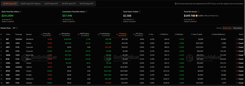 The US Bitcoin spot ETFs recorded a web influx of $241 million on September 24, persevering with their rebound after earlier outflows. The cumulative web influx has now climbed to $57.49 billion, whereas whole belongings beneath administration rose to $149.74 billion, representing 6.62% of Bitcoin’s market cap.