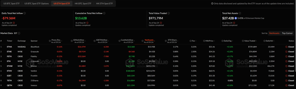 The US Ethereum spot ETFs recorded a web outflow of $79.36 million on September 24, marking one other day of weakened investor sentiment. Despite the retreat, cumulative inflows throughout all ETH ETFs nonetheless whole $13.62 billion, whereas whole belongings beneath administration stand at $27.42 billion—representing 5.45% of Ethereum’s market cap.