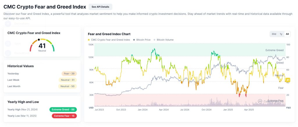 Meanwhile, market sentiment has barely improved however stays cautious. The CMC Crypto Fear and Greed Index is now at 41, up from 39 yesterday, although nonetheless properly under final week’s studying of 51. While technically within the “impartial” vary, the index has been hovering close to the “concern” zone for a number of days.