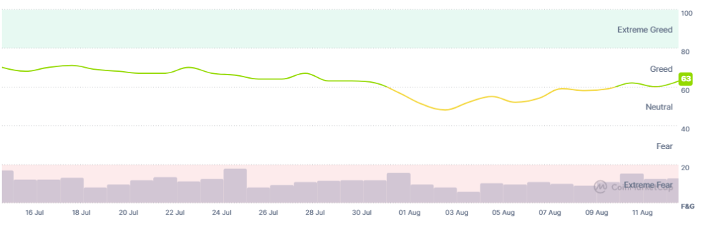 Meanwhile, the crypto market sentiment has increased slightly today within the greed zone. The crypto fear and greed index is up to 63 today from 60 yesterday.