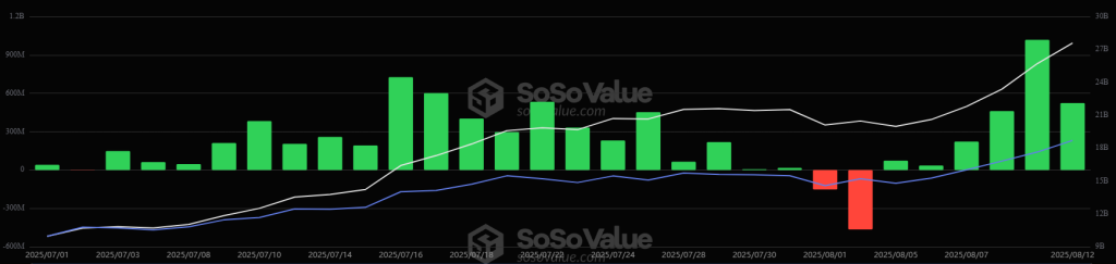 At the same time, the US ETH ETFs took in $523.92 million, following a record-breaking $1.02 billion recorded on Monday.