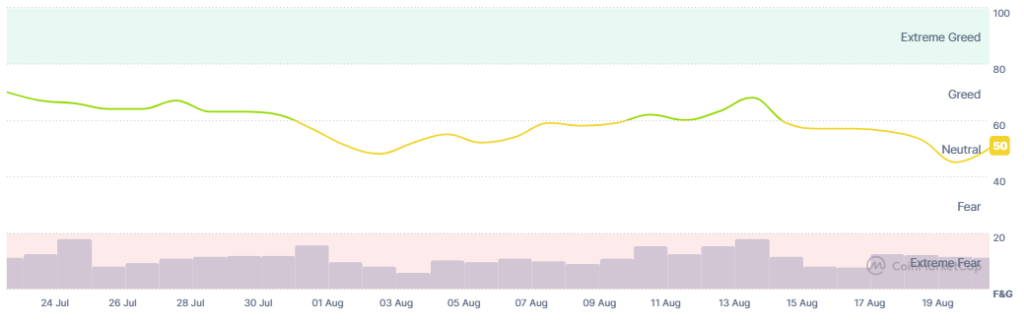 Furthermore, the crypto market sentiment increased as well. While still in the neutral zone, the crypto fear and greed index rose from 45 yesterday to 50 today.