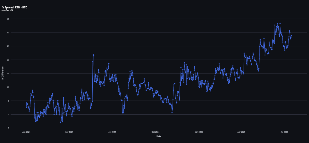 Time series of the difference between ETH and BTC ATM volatility for the 30-day tenor between 1 January 2024 and mid-July 2025