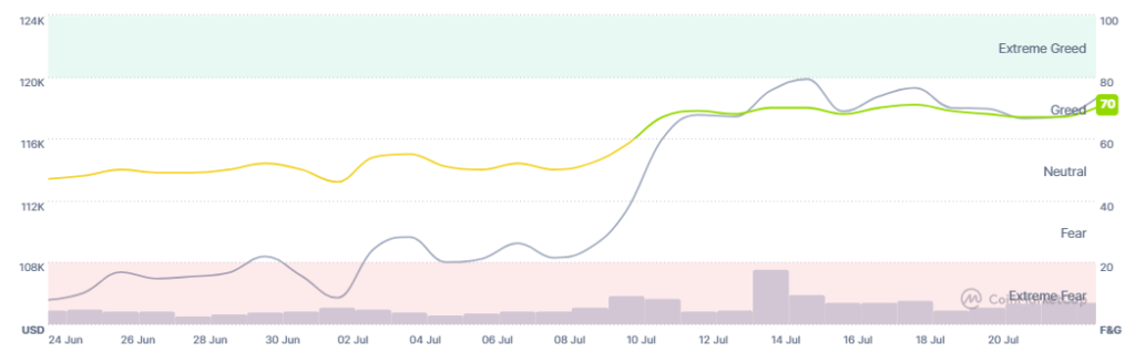 Meanwhile, the crypto market sentiment keeps moving slightly up and down within greed territory, between 68 and 71. It stands at 70 today, up from 68 yesterday.