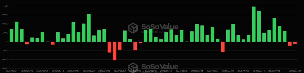 Furthermore, on 22 July, the US BTC spot exchange-traded funds (ETFs) recorded outflows again, for the second day in a row. The drops followed a 12-day streak. ETFs saw $67.93 million in outflows.