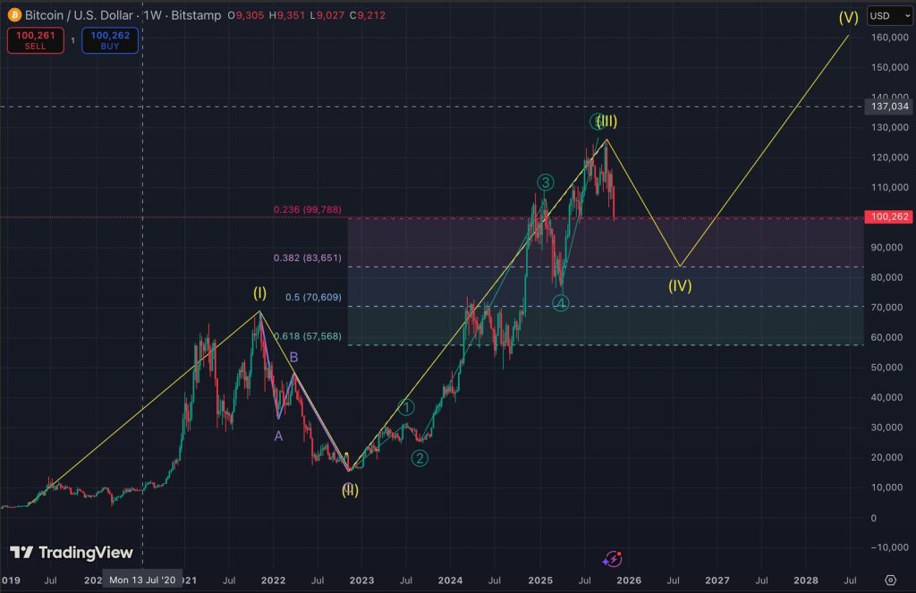 One of the important thing 4th wave targets is the 23.6% Fibonacci retracement, which sits at $99,000, he continues. “We have but to shut under that degree, so that is the place I anticipate the primary bounce.”
