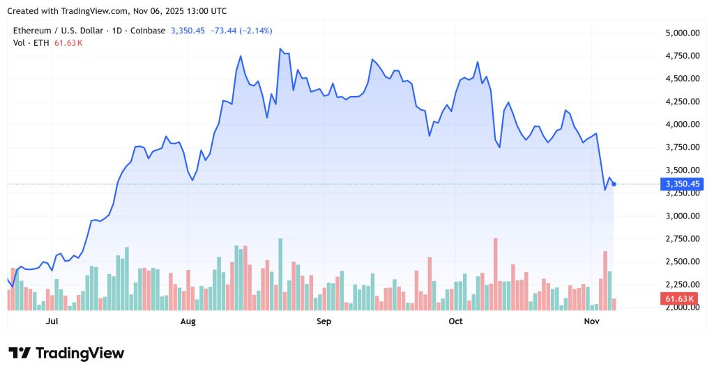 Ethereum (ETH) trades at $3,350, marking a 2.14% day by day decline. The asset slipped from an intraday high close to $3,420 and briefly examined lows round $3,300 earlier than recovering barely.