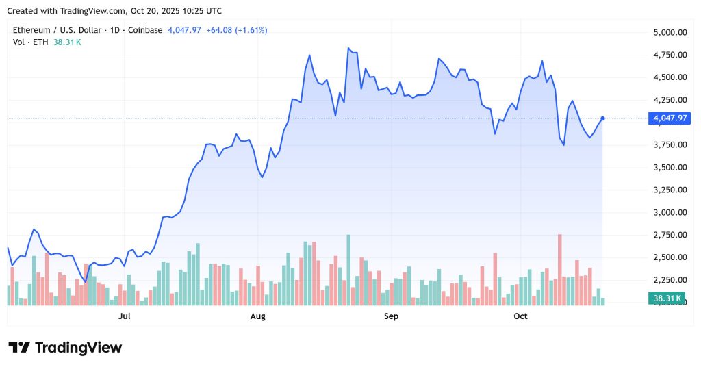Meanwhile, Ethereum is buying and selling at $4,047, gaining 1.61% in the identical interval. ETH briefly dipped beneath $3,900 earlier than rebounding to the day’s high close to $4,080. The asset stays range-bound as merchants weigh near-term route amid blended market sentiment.