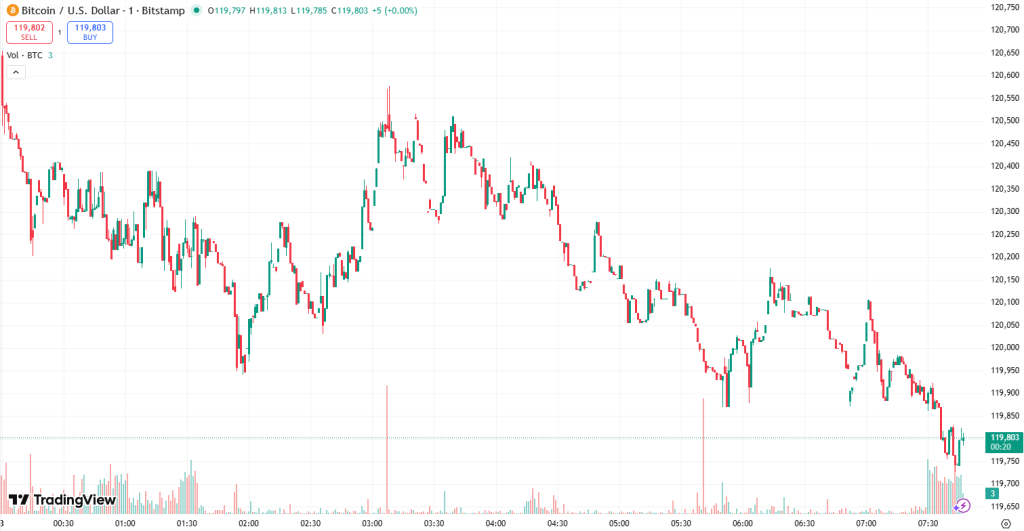 At the time of writing on Friday morning, BTC trades at $119,909. The value noticed a rise from the intraday low of $118,416 to the intraday high of $121,044. It has decreased barely since this every day high.