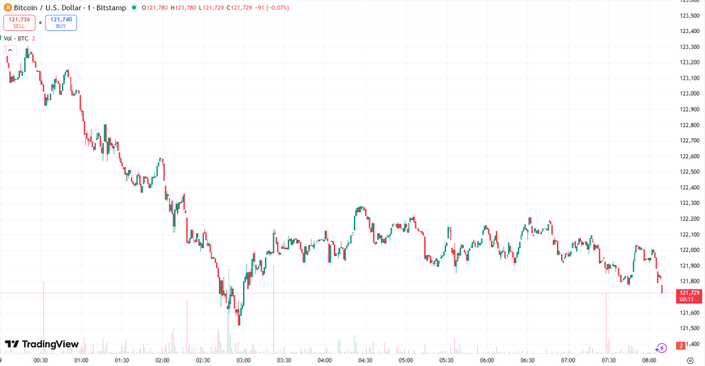 At the time of writing on Thursday morning, BTC trades at $121,793. Earlier within the day, the value surged to the intraday high of $124,072, earlier than dropping to the low of $121,432 after which recovering to the present value.