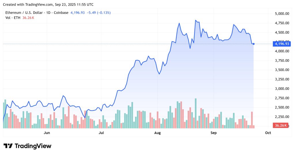 Ethereum is at the moment buying and selling at $4,196.93, down 0.13% on the day. The worth has cooled off after briefly climbing above $4,500 earlier this month. Volume stays modest at 36.26K, reflecting cautious market sentiment.