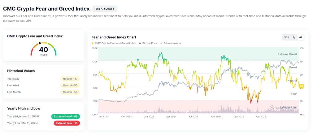 Meanwhile, market sentiment in crypto has softened barely. The CMC Crypto Fear and Greed Index now stands at 40, down from 47 yesterday, 50 final week, and 56 final month, reflecting a cautious shift amongst buyers.
