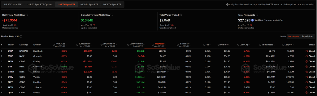 The US Ethereum spot ETFs recorded $75.95 million in internet outflows on September 22, breaking the current streak of secure inflows. The cumulative internet influx now stands at $13.84 billion, with solely one of many 9 ETFs seeing inflows on the day.