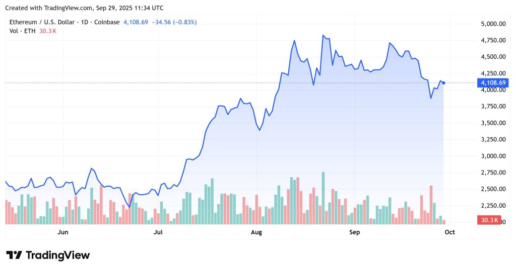 Meanwhile, Ethereum is buying and selling at $4,108.69, down 0.83% prior to now 24 hours. ETH not too long ago dropped from highs above $4,250 however bounced again after briefly dipping beneath $4,000.