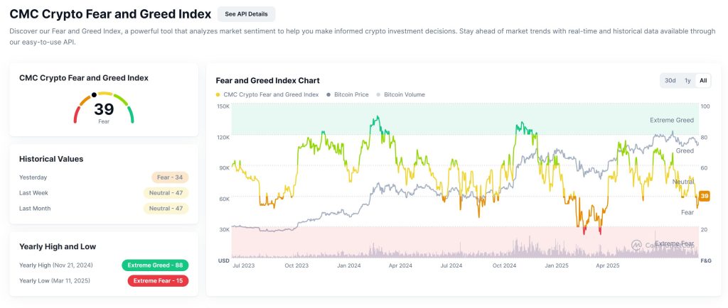 Meanwhile, crypto market sentiment stays cautious. The CMC Crypto Fear and Greed Index at present stands at 39, reflecting a “Fear” studying. This marks a slight uptick from 34 yesterday, however nonetheless a decline from 47 final week and 47 final month, indicating a rising sense of hesitation amongst traders.
