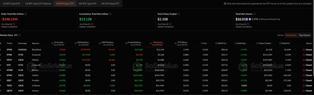US Ethereum spot ETFs registered a major web outflow of $248.31 million on September 26. BlackRock’s ETHA led the redemptions with a $199.87 million outflow, adopted by Fidelity’s FETH, which misplaced $74.39 million. Grayscale’s ETHE was the one ETF to file inflows, including $8.05 million, whereas its different product, ETH, held flat with no web change.