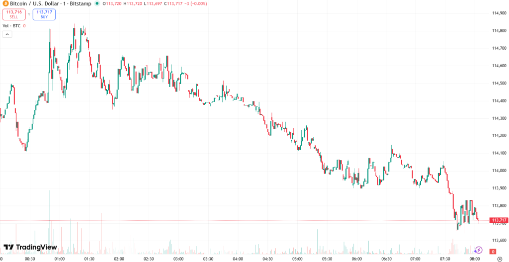 At the time of writing on Tuesday morning, BTC trades at $113,992. There was a notable surge earlier within the day from the low of $111,808 to the intraday high of $114,762. This can be the coin’s intraweek high.