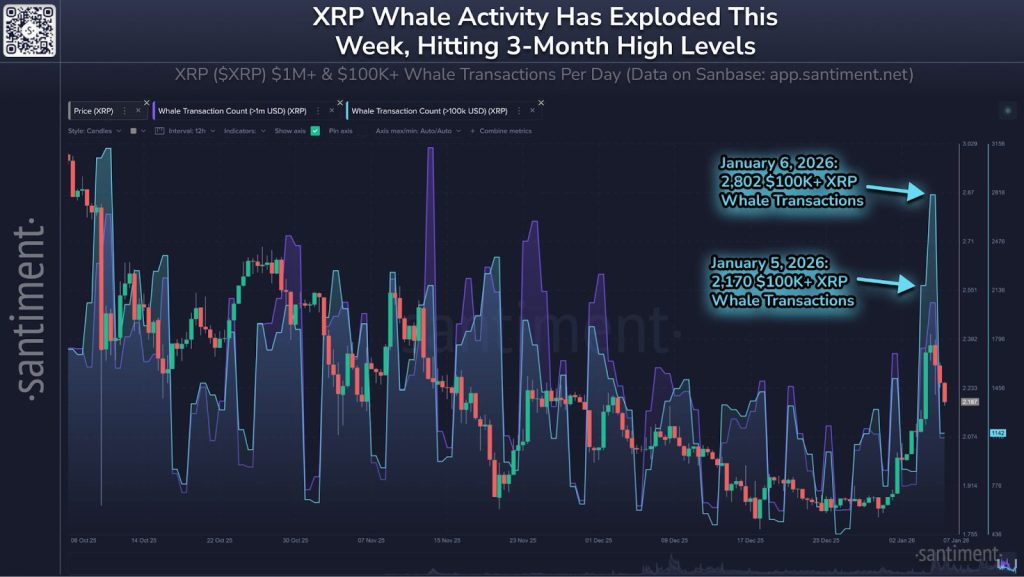 At the identical time, Santiment information points to a surge in massive XRP transactions, with transfers above $100,000 hitting a three-month high earlier this week, an indication of heightened positioning fairly than a transparent directional wager.