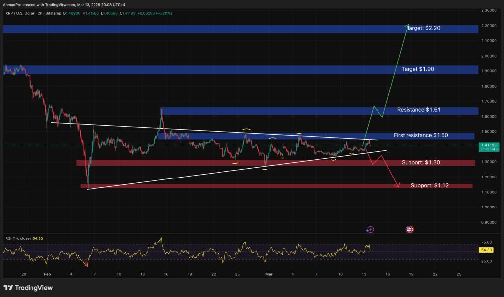 XRP worth is sitting at $1.40, buying and selling inside a symmetrical triangle that has been compressing because the February lows.