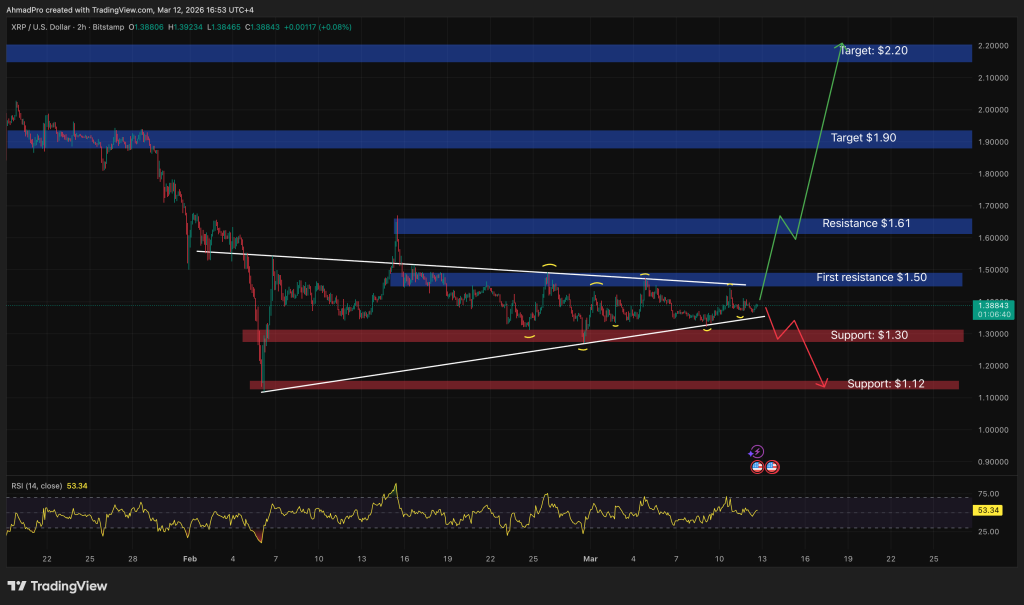 XRP is sitting at $1.38 on the 2h chart, locked inside a symmetrical triangle that has been tightening since early February, with value coiling between converging trendlines and the clock ticking on a decision.
