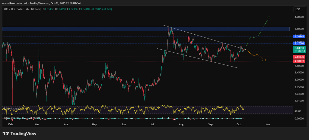 XRP is urgent in opposition to the higher fringe of its descending channel after a clear transfer above $3.00, displaying rising bullish stress. The subsequent resistance ranges are round $3.17 and $3.36, and if momentum holds, a run towards the $3.60–$4.00 zone seems to be possible.