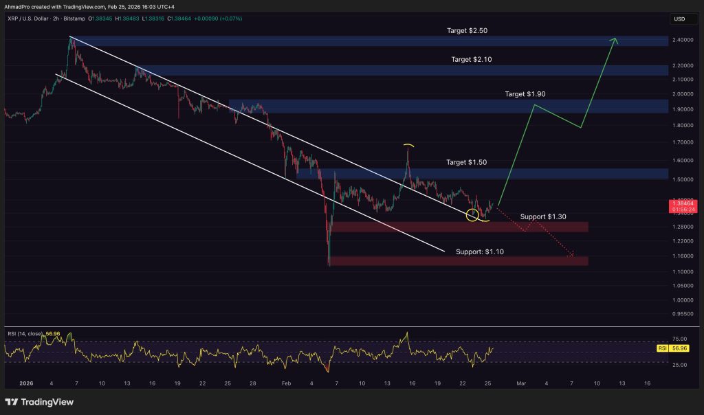 As lengthy as XRP prints increased lows above $1.30 and holds outdoors the channel, the short-term bias stays constructive.