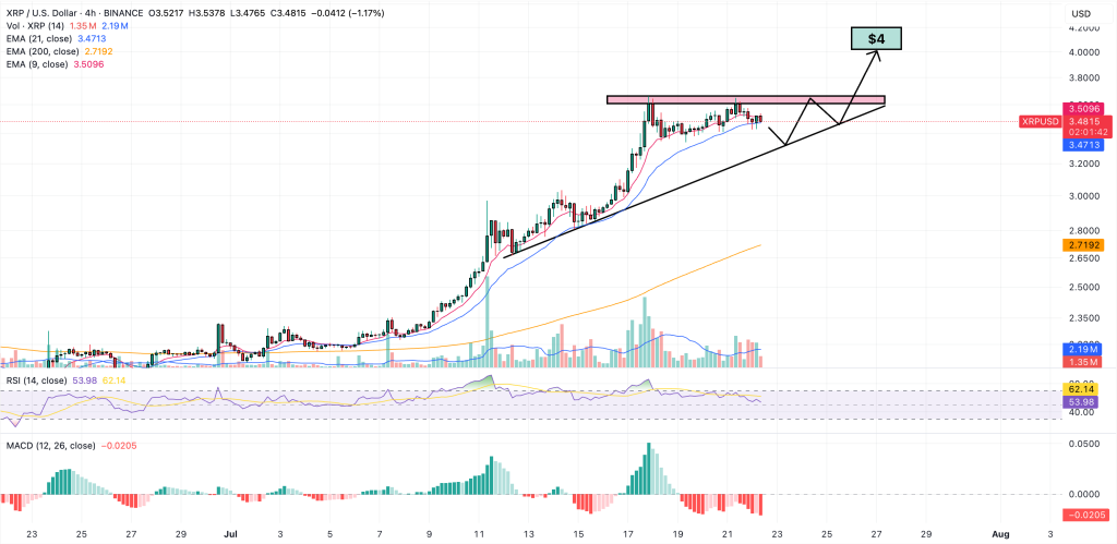 While the rally appears somewhat extended, the next likely target remains the $4 psychological threshold — but only if the lower trend line support holds over the coming days. A move above that level would mark a break past XRP’s previous all-time high.